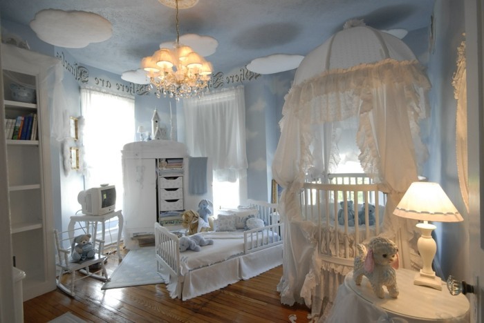 Babyzimmer komplett blaue wönde nachtlampe runder tisch holzboden kinderbett fernseher hellblauer teppich