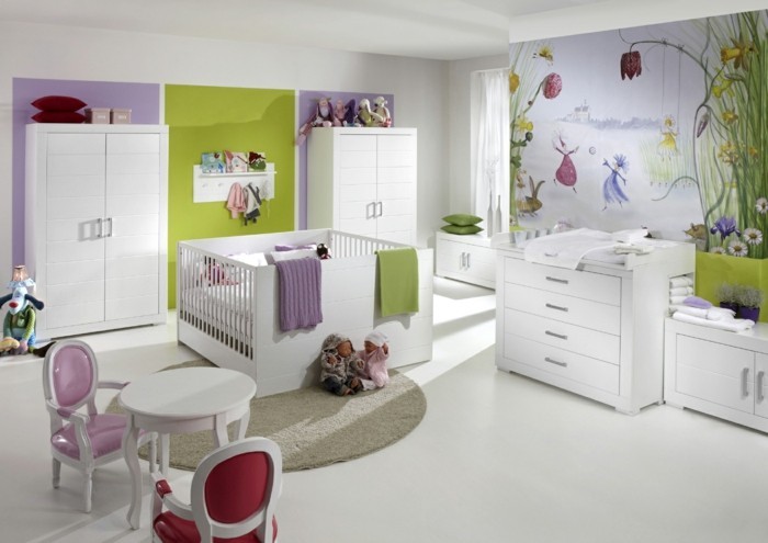 Babyzimmer komplett einrichten babyzimmer tapete runder plüschteppich weißer boden grüne wand roter lederstuhl
