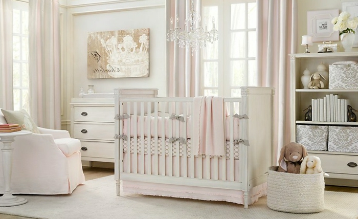 Babyzimmer komplett weiß rosa einrichtung plüschteppich weißer runder tisch wandbild spruch kronleuchter kristall