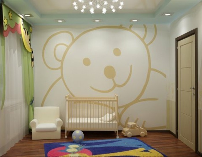 Babyzimmer tapete bär holztür holzboden sessel weiß musterteppich