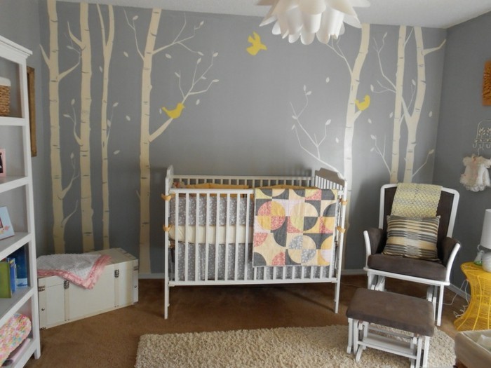 Babyzimmer tapete bäume vögel teppich polsterstuhl polsterhocker kisse mit muster