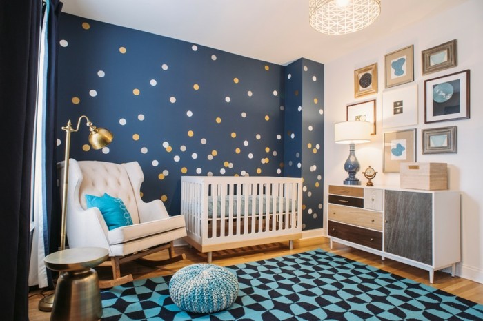 Babyzimmer tapete blau punkten musterteppich jungen kinderzimmer runder metalltisch