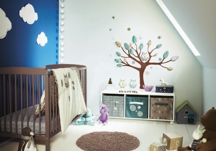 Babyzimmer tapete coole wanddeko kinderzimmer teppich weißer boden babybett dunklem holz