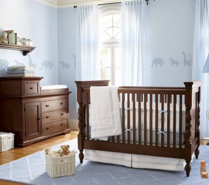 Babyzimmer tapete hellblau exotische tiere babybett holz musterteppich kommode holz