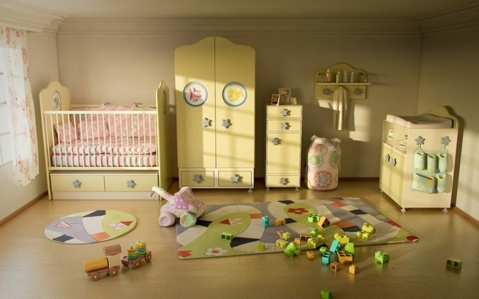 Babyzimmer wandgestaltung parkettboden musterteppich spielzeuge gelber gelbe einrichtung