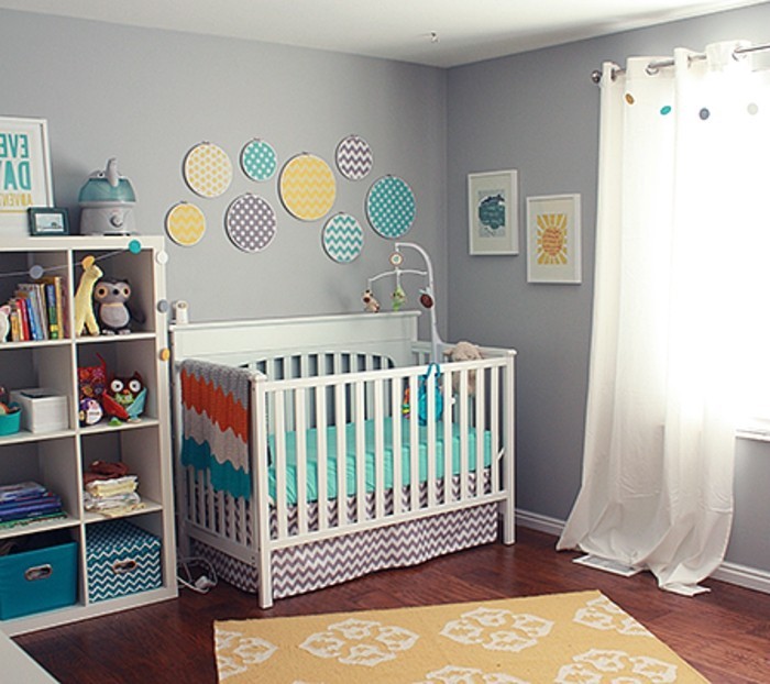 Babyzimmer wandgestaltung wanddeko graue wand dunkler holzboden musterteppich regal
