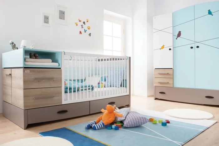 süß-ausgestattetes-Kinderzimmer-blauer-Schrank-Vögel-Zeichnungen-Babybett-