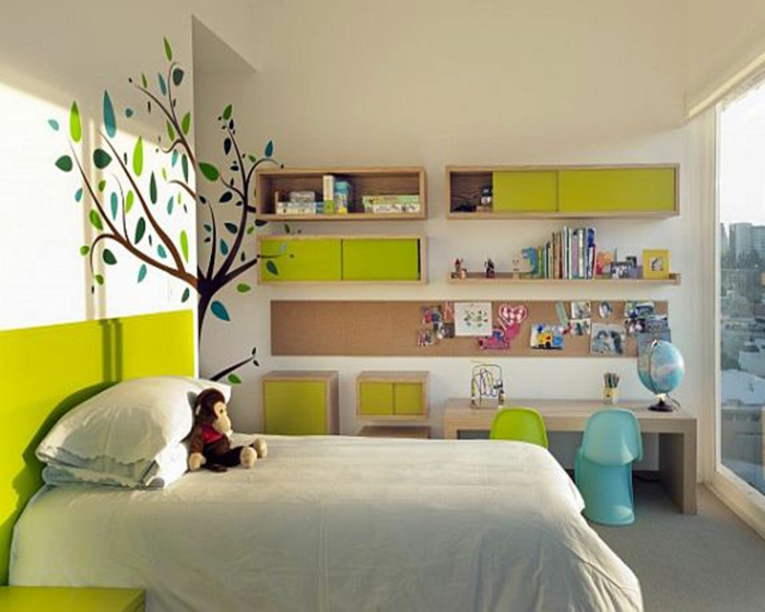 Kinderzimmer jungs kleines zimmer dezent einrichten grün blau affe kuscheltier große fenster