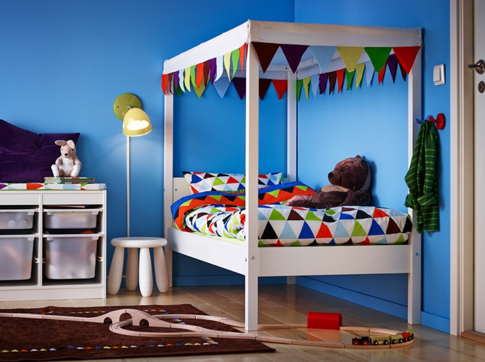 Jungenzimmer gestalten zug eisbahn teppich bett in bunten farben teddybär schrank