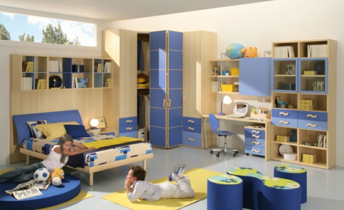 Kinderzimmer einrichten kinder spielen im zimmer in blau und gelb junge mädchen spielen