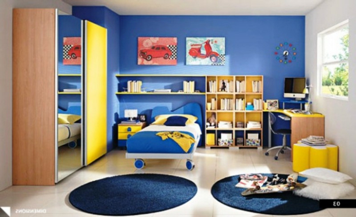 Kinderzimmer für jungs jungenzimmer in blauer farbe gelbe deko rote bilder rotes auto motorrad teppich