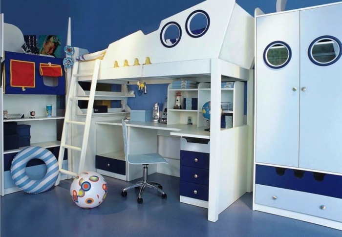 Kinderzimmer gestalten wie ein schiff design in blau und weiß mit runden fenstern kleiderschrank wie kajüte