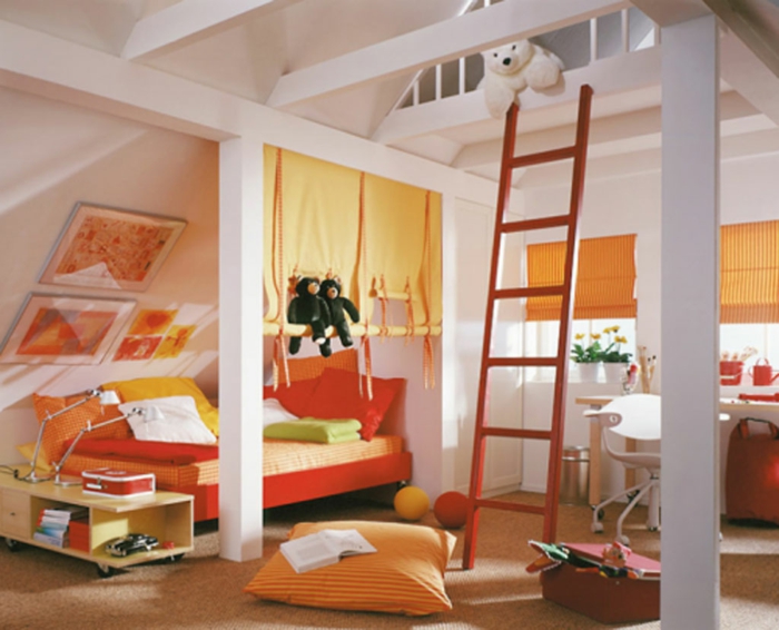 Kinderzimmer ideen jungs dachzimmer kreativ einrichten gelb orange affen deko spielzeuge treppe