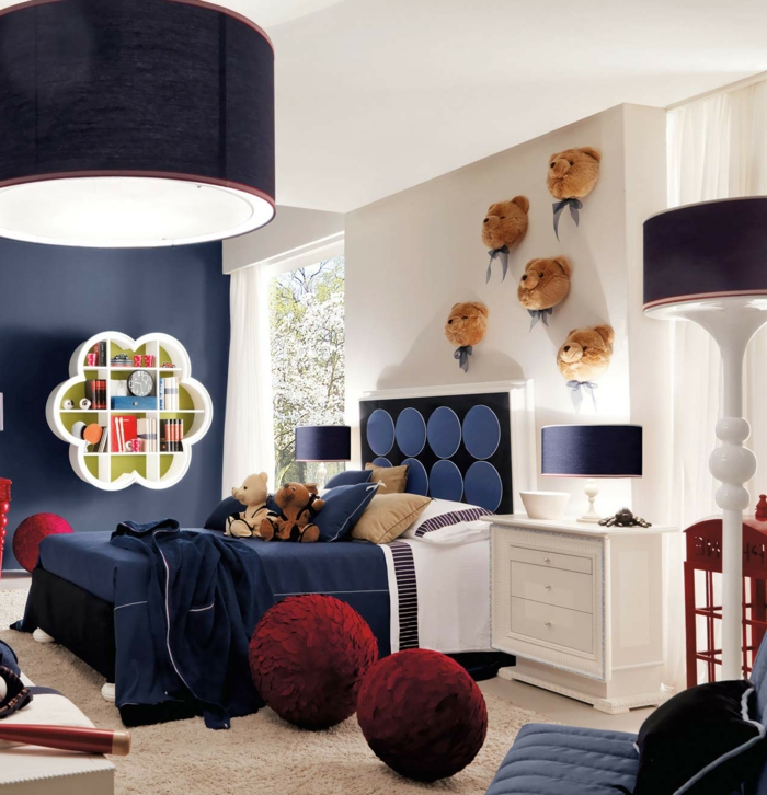 Kinderzimmer junge dunkelblau und weiß kontrast hell dunkel teddybär deko bären kuscheltiere