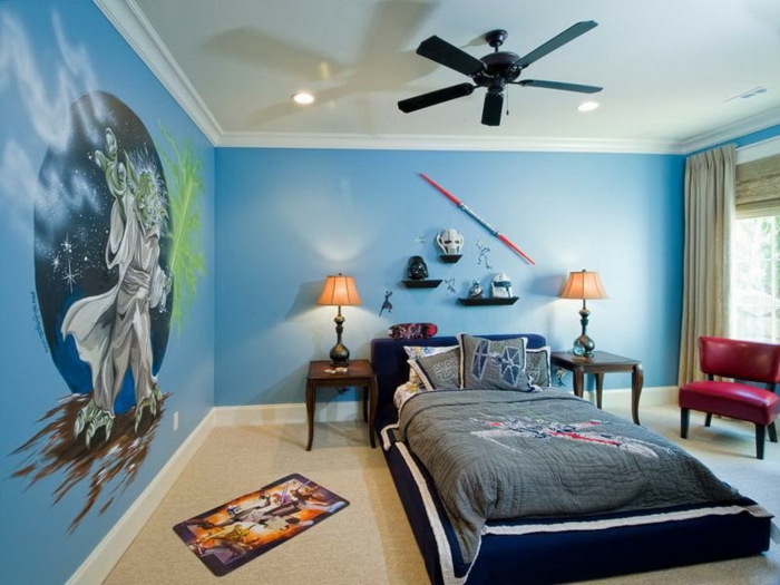 Kinderzimmer junge starwars zimmer wandmalerei wandfarben blau und weiß film motiv einrichtung