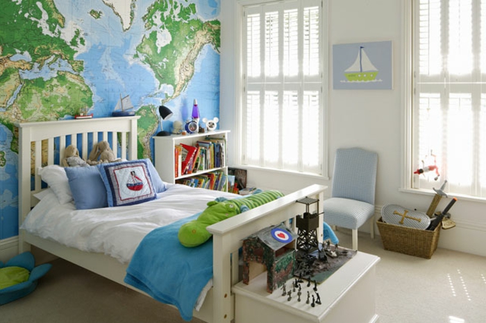 Kinderzimmer junge weltreise in dem eigenen zimmer machen weltkarte schiff boot deko grün blau