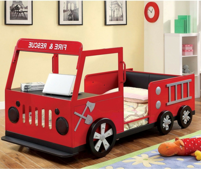 Jungenzimmer gestalten bett in form von feuerwehr auto roter wagen bettideen wanddeko bilder