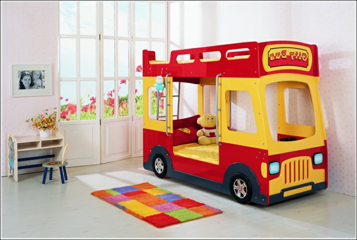 Kinderzimmer ideen bett in gelb und rot bus design vom bett im zimmer des jungen fenster