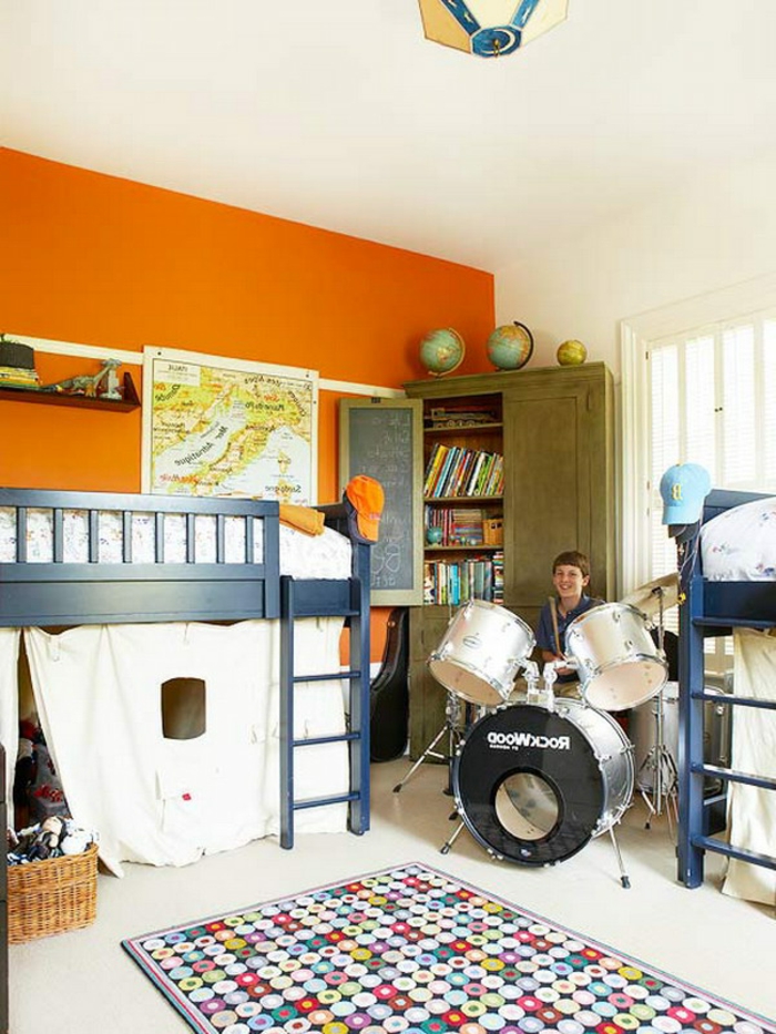 Jungen kinderzimmer krasse farben orange gelb bett design musik teppich trommel zelt im zimmer
