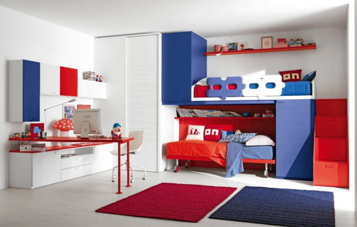 Kinderzimmer einrichten raum sparen zimmer in blau weiß und rot bett schreibtisch teppich