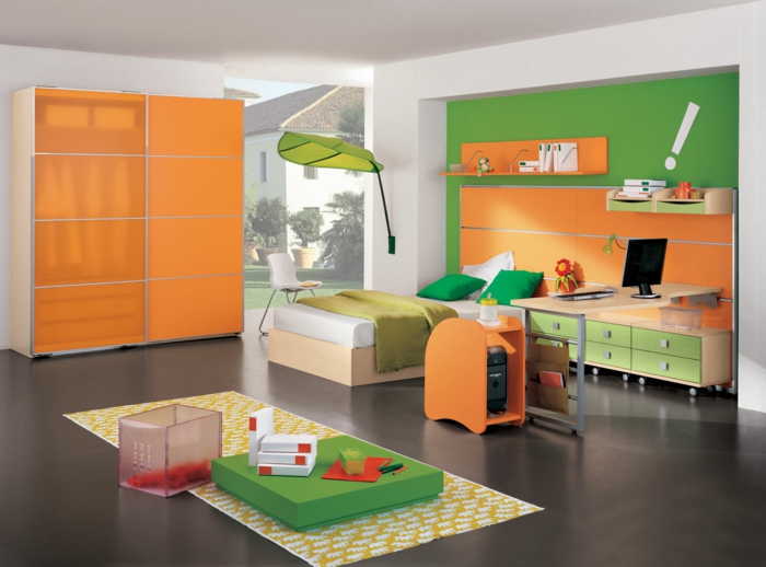 Kinderzimmer ideen grün und orange bei kinderzimmer einrichtung verwendung lampe in form von blatt