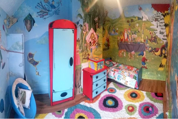 Wenn ein komplettes Wandbild zu viel ist: Konzentrieren Sie sich auf einen „Akzent-Ausschnitt“. Malen Sie zum Beispiel nur eine einzelne, große Pusteblume in eine Ecke, von der die Samen über die Wand fliegen. Oder lassen Sie eine Comicfigur wie die Minions nur hinter der Tür oder dem Bett hervorlugen. Das wirkt oft pfiffiger und weniger überladen als eine vollgepackte Wand.