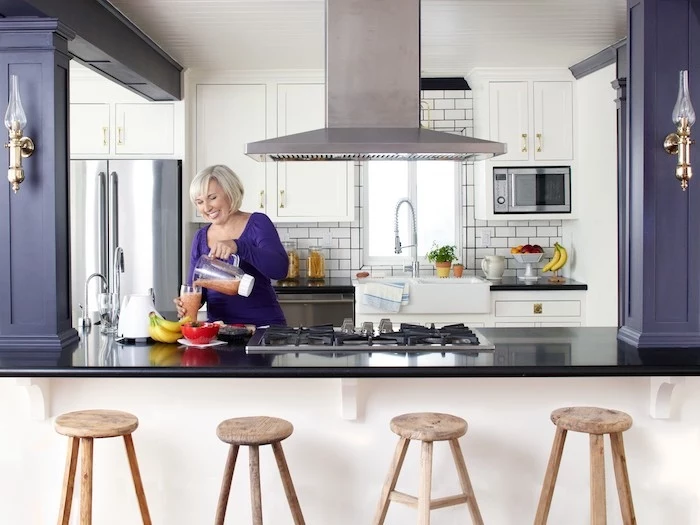 - Eine leicht überstehende Arbeitsplatte, die mit zwei Barhockern zur Frühstücksbar wird.