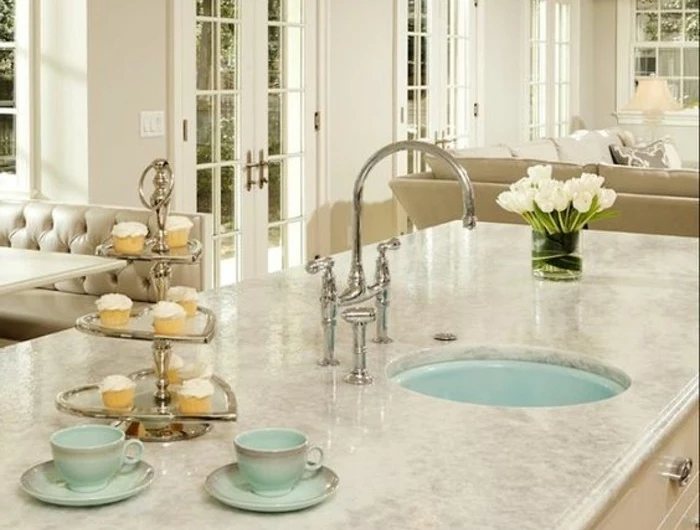 Quarzkomposit: Das sind Platten, die aus gemahlenem Quarz und Harzen gepresst werden. Sie sind extrem hart, absolut porenfrei und daher super pflegeleicht. Säure? Kein Problem. Kratzer? Kaum eine Chance. Der Nachteil? Es ist eben kein Unikat. Auch wenn die Dekore immer besser werden, fehlt ihnen oft die Tiefe und die kühle, seidige Haptik von echtem Stein. Und bei Hitze muss man etwas aufpassen.
