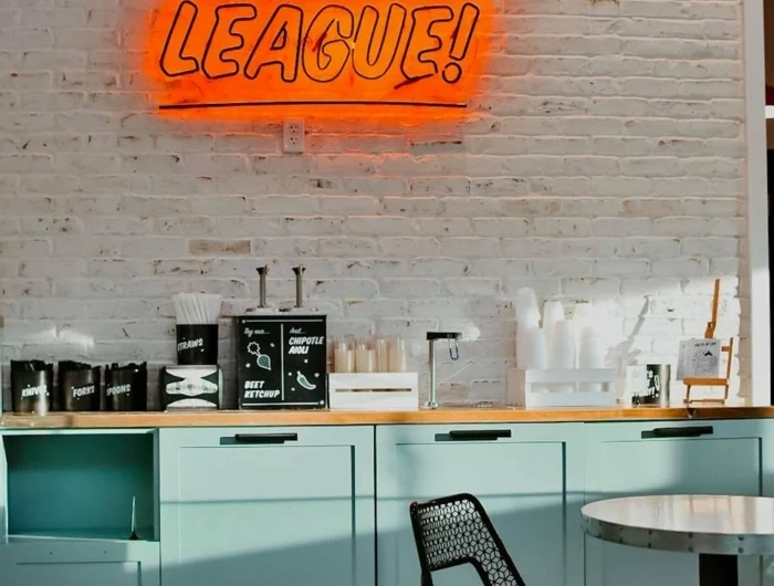 weiße Ziegelwand mit einem großen Neonlichtschild, Küchenschränke in blauer Farbe, schwarzer Stuhl, Küchen Dekorieren Tipps