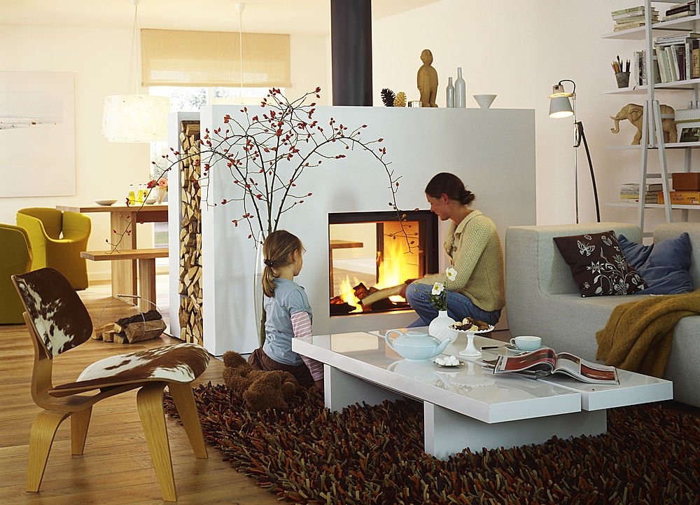 Offene feuerstelle pflanzendeko holzstuhl tiermotive parkettboden weißer couchtisch teppich gelbe stühle