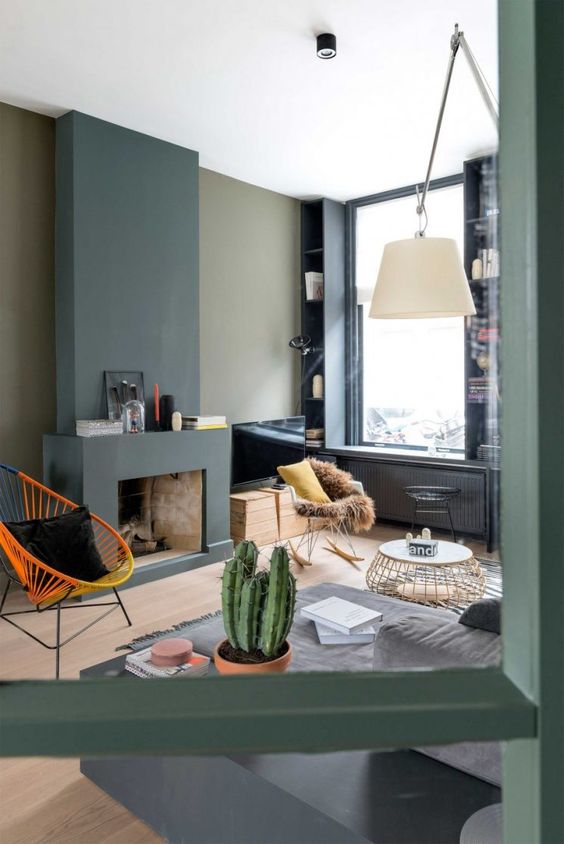 Kamin gemauert laminat farbige wände flechtstuhl gelb orange schwarze kisse schaukelstuhl kaktus runder couchtisch