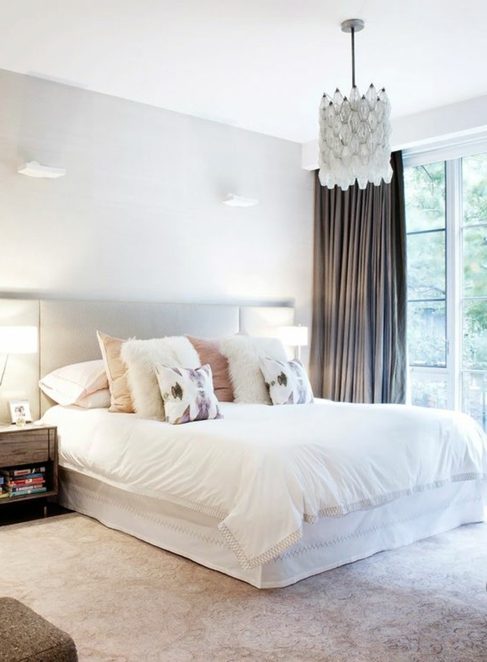 Deko ideen schlafzimmer kronleuchter weisses bett braune gardinen