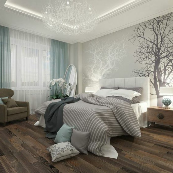 Deko ideen schlafzimmer wandsticker baum blaue gardinen boden aus holz