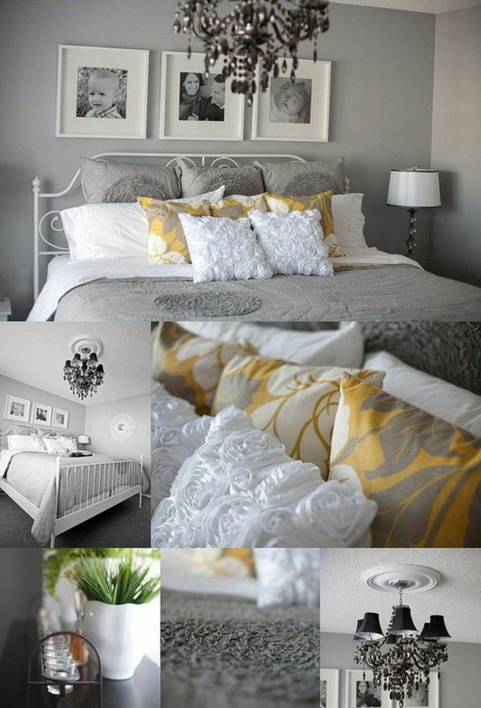 Deko schlafzimmer grau gelb pflanze schwarzer kronleuchter bett fotos