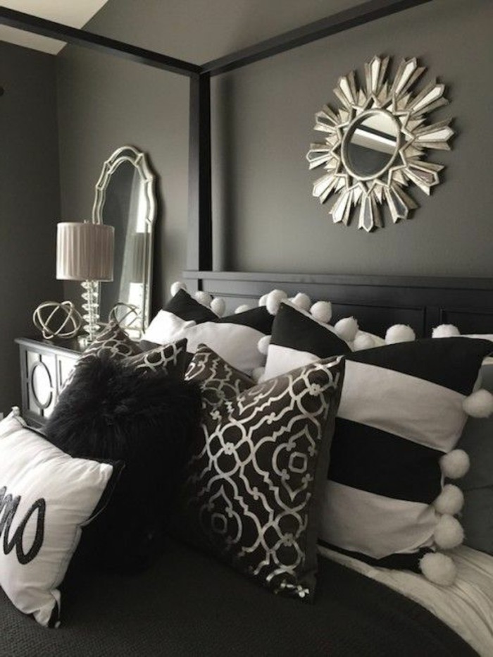 Deko tipps graue waende spiegel schwarzes bett kissen in weiss und schwarz