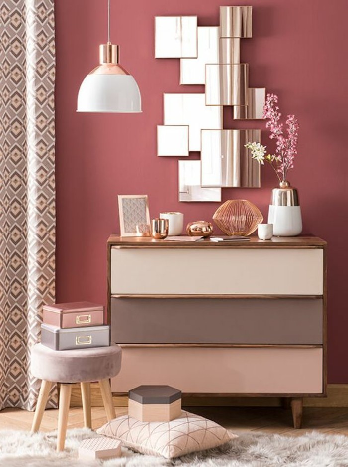Deko tipps spiegel rosa blume lampe schrank hocker