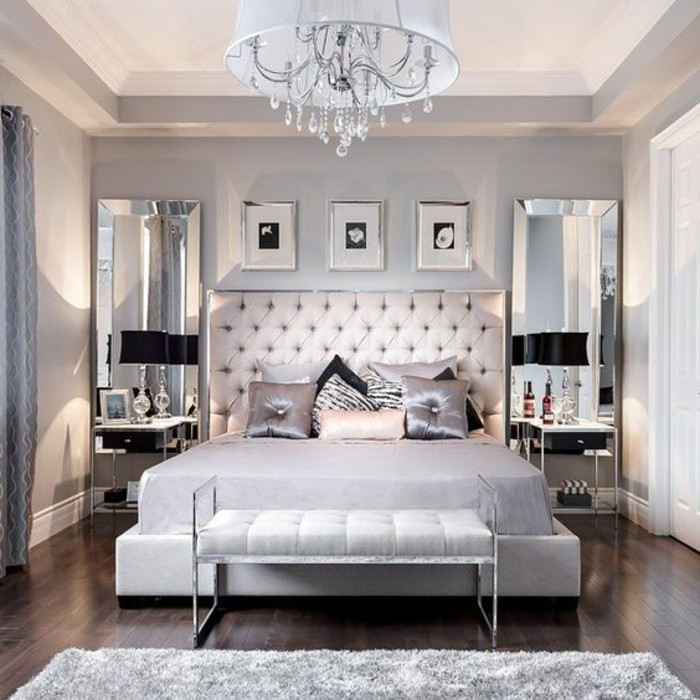Gestaltung schlafzimmer kronleuchter bett spiegeln modern weisser hocker