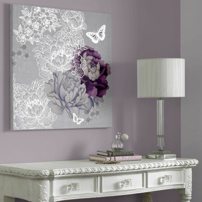 Gestaltung schlafzimmer lila weisser tisch bild mit blumen