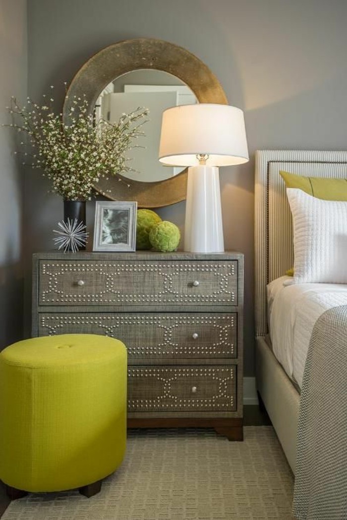 Gestaltung schlafzimmer nachtschrank lampe runder spiegel hocker