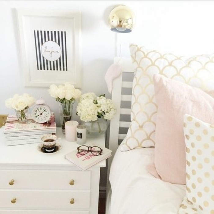 Schlafzimmer deko bilder rosen goldene lampe bett nachttisch
