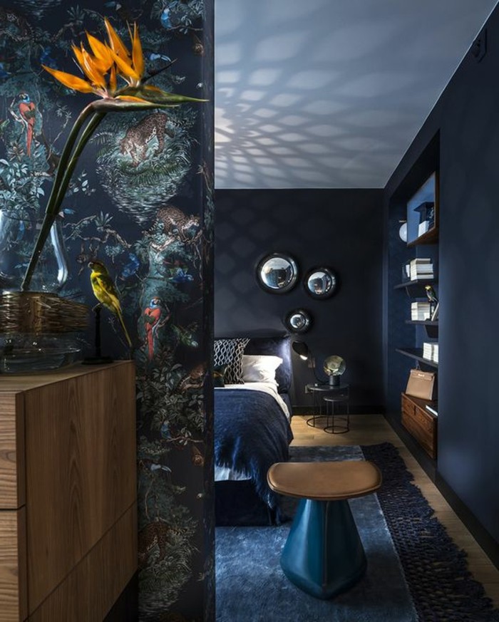 Schlafzimmer dekorieren schwarz blumen bett spiegel