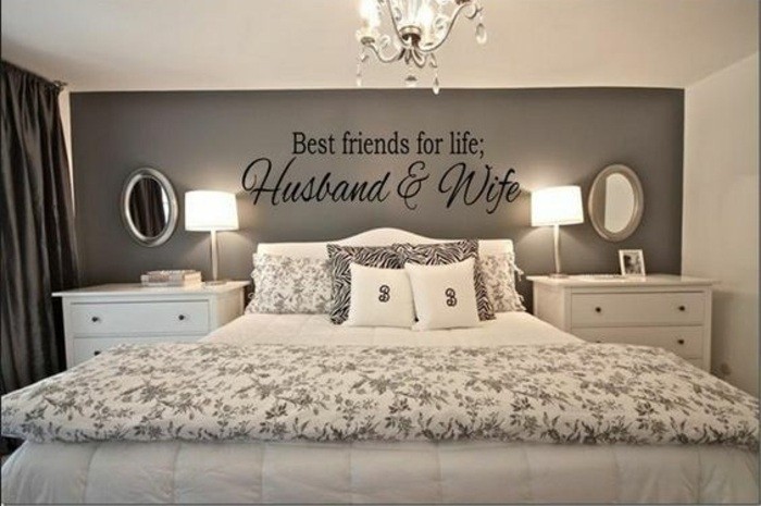 Schlafzimmer ideen graue wand kronleuchter wandspuch weisses bett