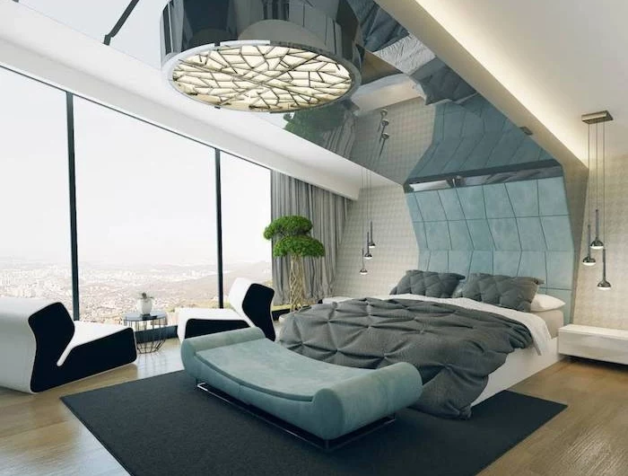 zimmer einrichten ideen, minimalistische einrichtung, große fenster, graues bett