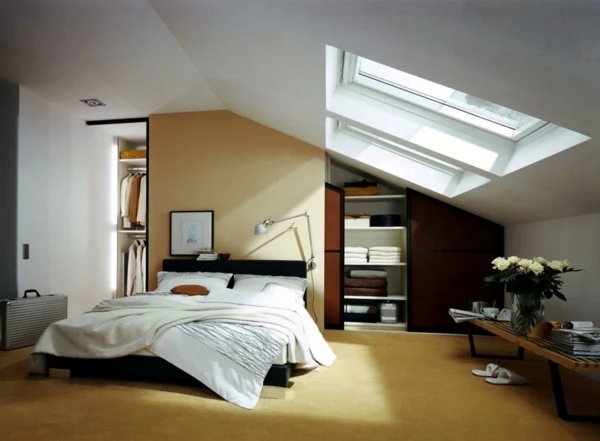 - Frei im Raum mit Blick zum Fenster: Eine mutige, luxuriöse Variante für größere Dachräume, die ein echtes Hotel-Feeling erzeugt.