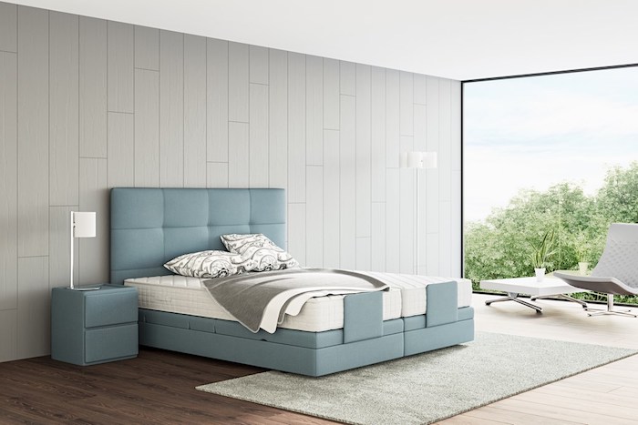 Boxspringbett blau schlafzimmereinrichtung minimalistisch riesige fenster