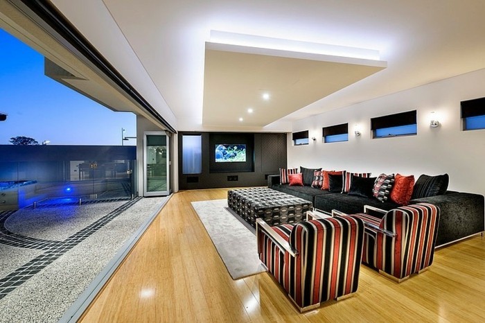 Effektvolles großes wohnzimmer herrliche deckenbeleuchtung