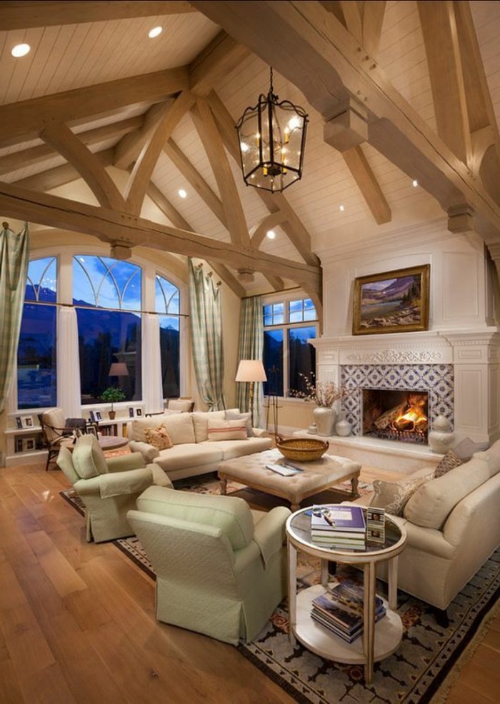 Interessante zimmerdecke im wunderschönen wohnzimmer kamin und möbel