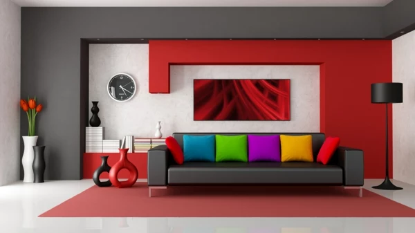 Schöne elegante Wohnzimmer – stilvolle Kombination aus Weiß und Rot!