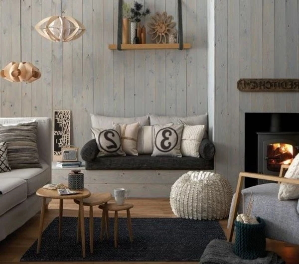 Gemütliches Wohnzimmer mit hölzernem Nest Tisch und großem Kamin