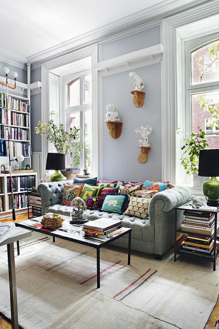 Helles Wohnzimmer Bücherwand graue Wände Figuren an der Wand Chesterfield bunte Kissen resized resized
